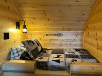 Kids themed bunk room with two log bunk beds each with their own light and USB/Power outlets.